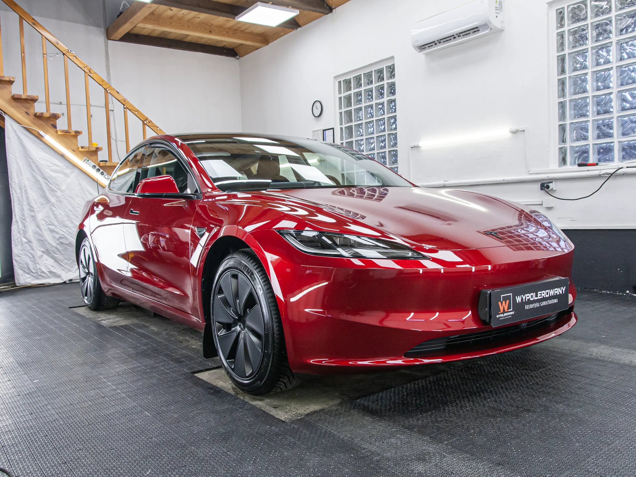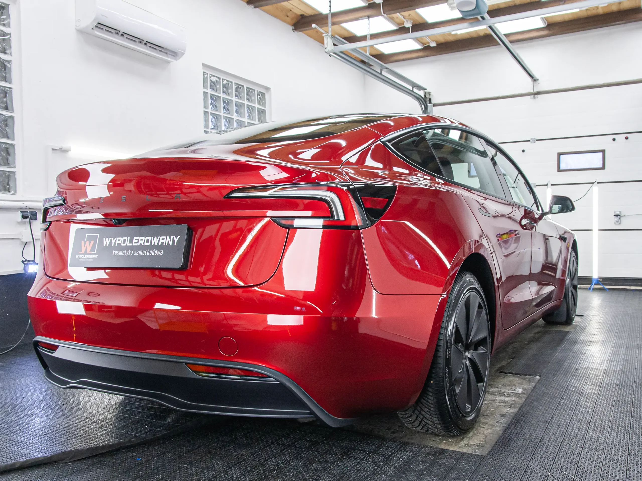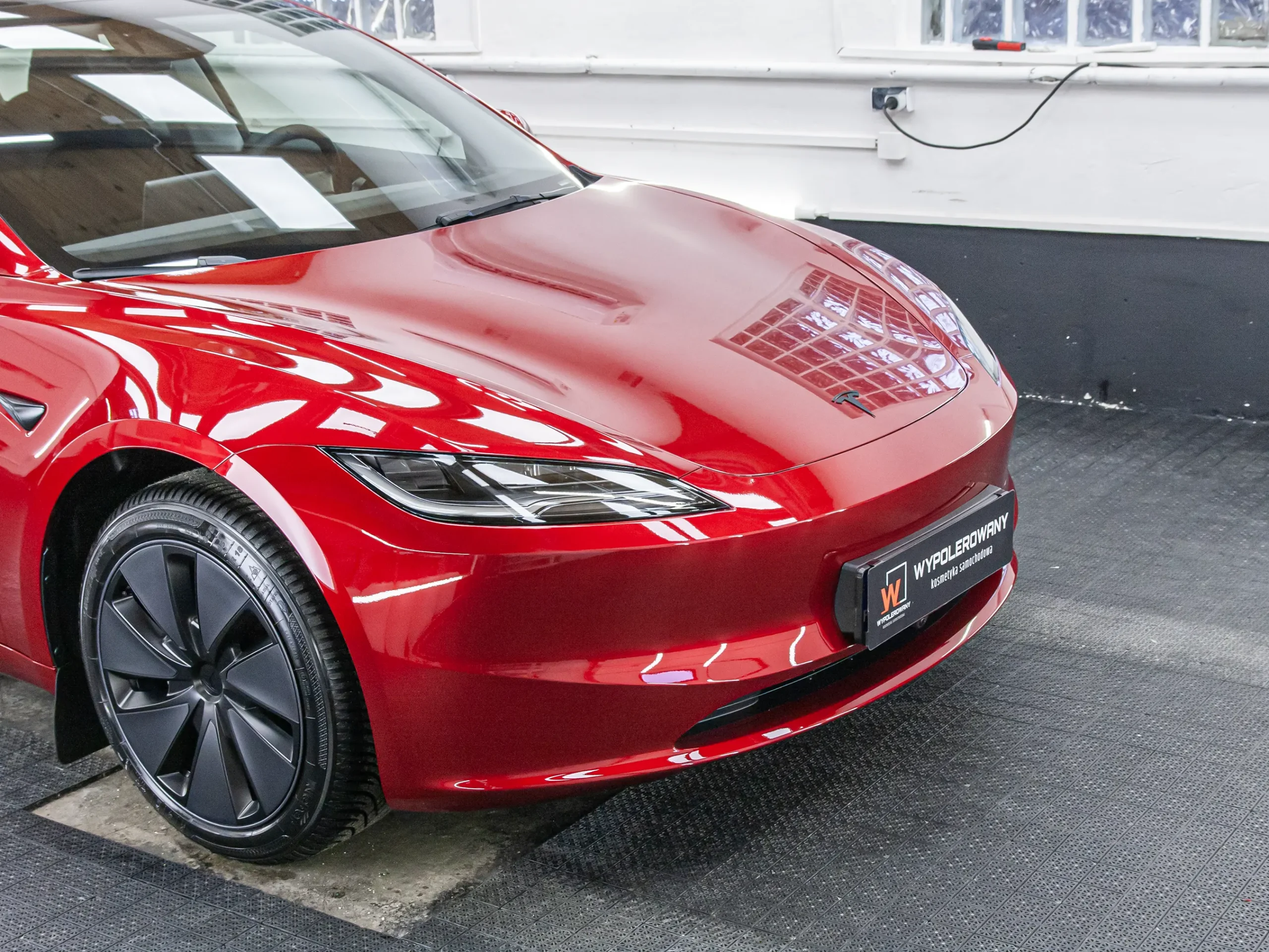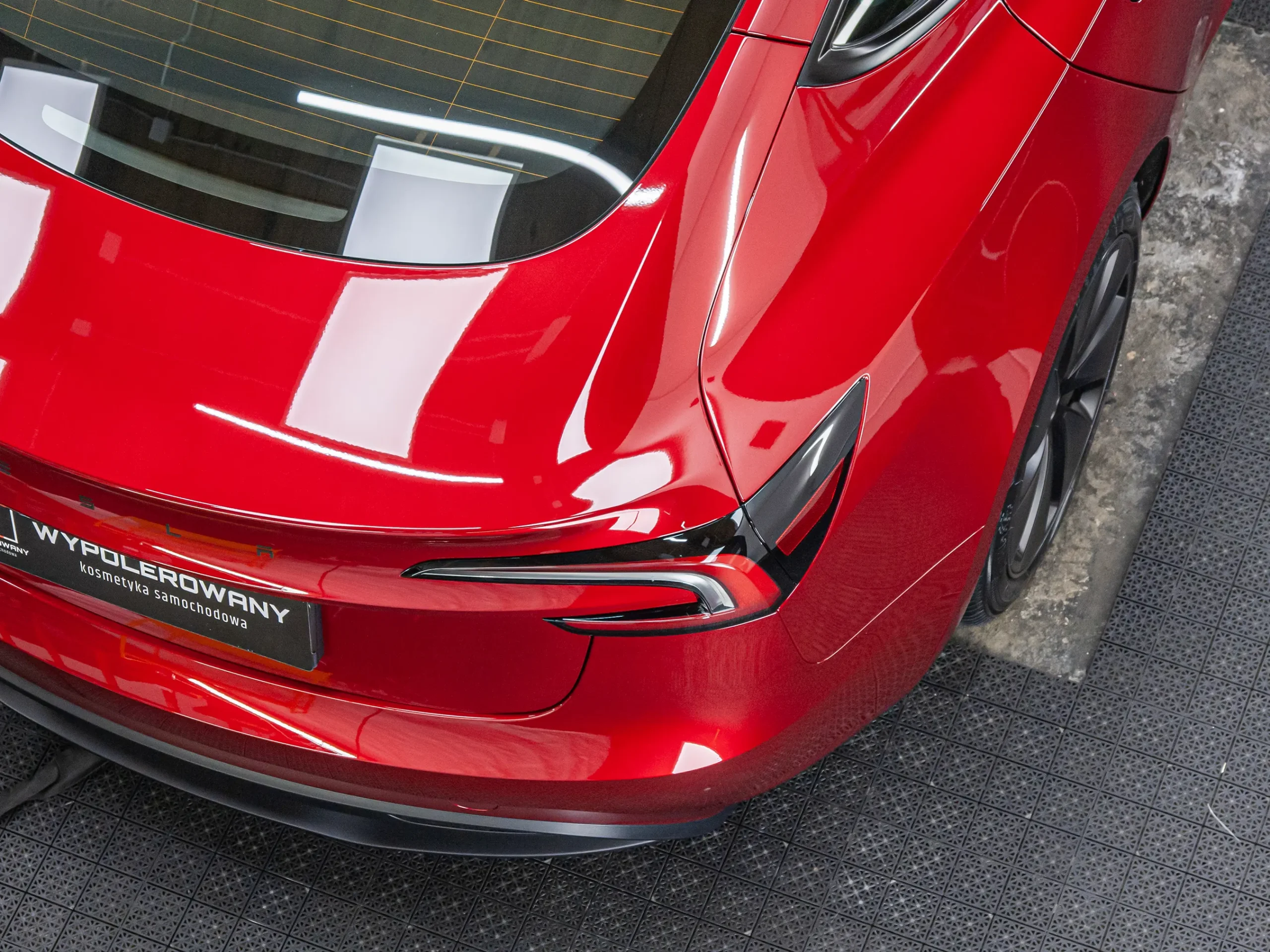 W ramach pakietu zawsze dążę do idealnej głębi koloru. W przypadku czerwonej Tesli wykonałem jednoetapowe polerowanie lakieru, usuwając wszelkie niedoskonałości. Maszynowo odświeżyłem również szyby i dach panoramiczny pod aplikację powłok hydrofobowych.